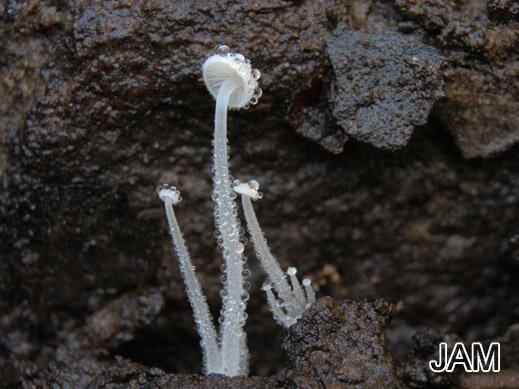 Foto 1: Tautropfen-Scheinhelmling (Hemimycena tortuosa)